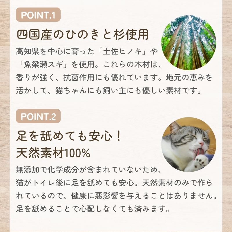原料は天然の四国産ひのきとすぎのみで、添加物は一切使用していません。だから安心で安全です。
