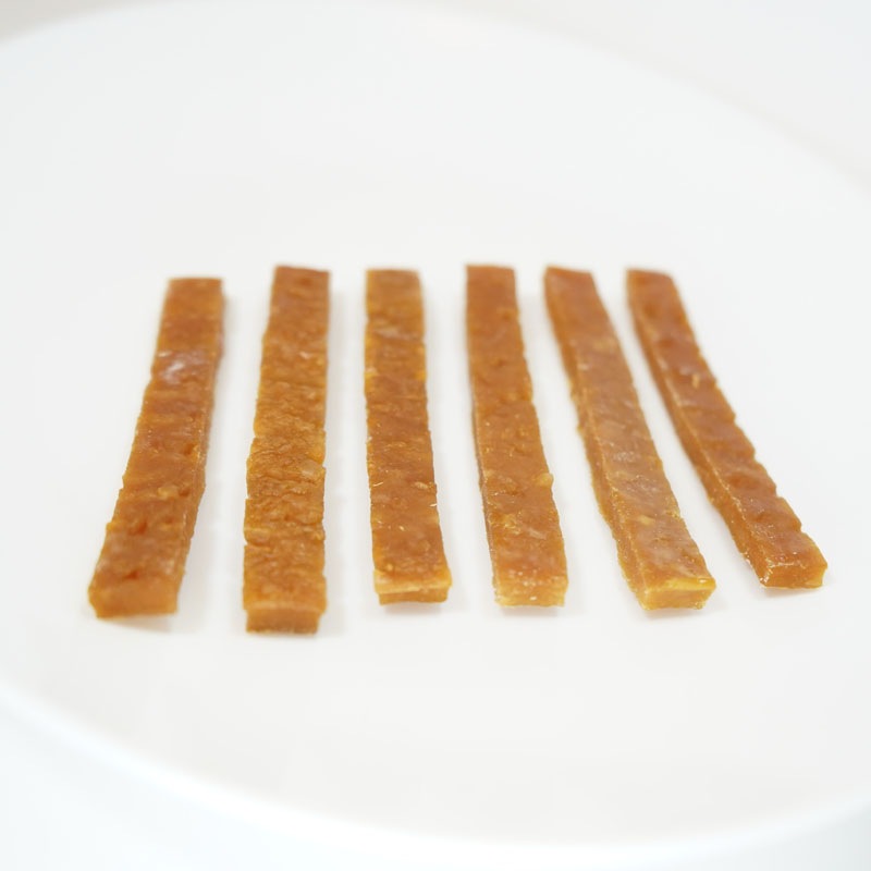 原材料の99%が鶏ささみなので、お肉のおいしさや香りが活きています。また、お肉がギュっと詰まって噛み応えのある食感に仕上がっているので、のどに詰まらせないよう、オーナー様が手で持って与えるか、小さくちぎって与えてあげるのがおすすめです。