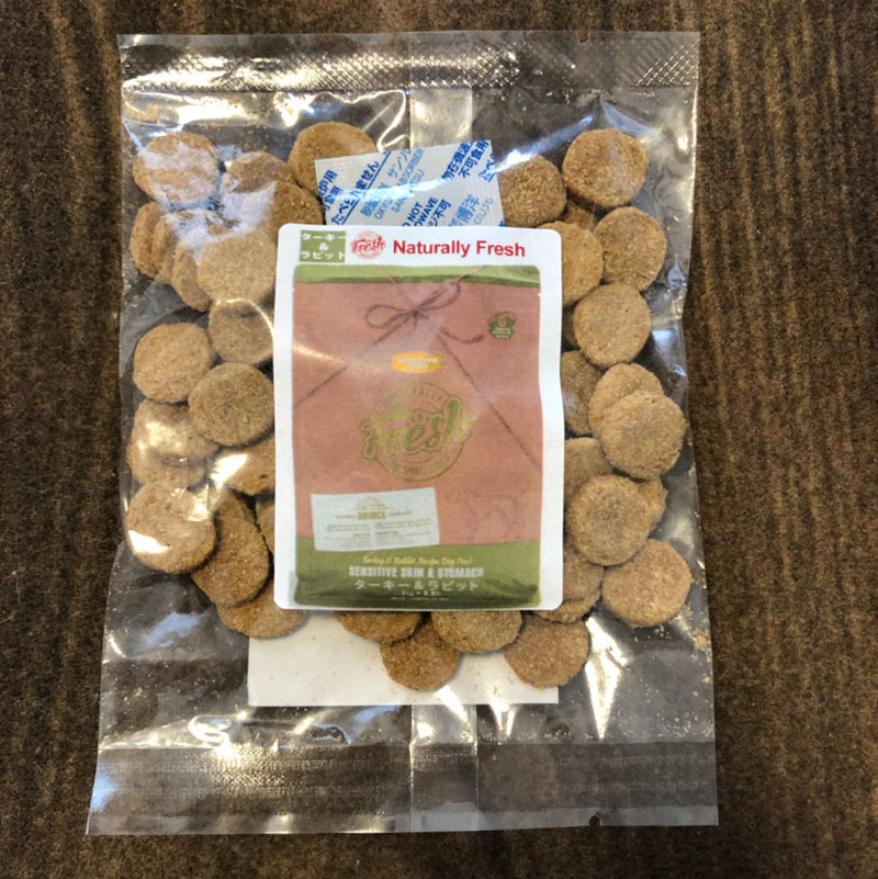 骨抜き七面鳥、白インゲンマメ、エンドウ豆、乾燥全卵、ハトムギ、キャノーラ油(ミックストコフェロール類で保存)、骨抜きうさぎ肉、トウジンビエ、亜麻仁、二リン酸カルシウム、天然香味料、炭酸カルシウム、キヌア、塩化ナトリウム、ビタミン類[塩化コリン、ビタミンEサプリメント(保存料)、L-アスコルビン酸-2-ポリリン酸(酸化防止剤)、ナイアシン、ベータカロチン(酸化防止剤)、D-パントテン酸カルシウム、ビタミンAサプリメント、リボフラビン、ビタミンB12サプリメント、硝酸チアミン、塩化ピリドキシン、ビタミンD3サプリメント、葉酸]、ミネラル類[硫酸亜鉛、硫酸鉄、硫酸銅、硫酸マンガン、亜セレン酸ナトリウム、ヨウ素酸カルシウム、亜鉛タンパク化合物、銅タンパク化合物、マンガンタンパク化合物、鉄タンパク化合物]、乾燥チコリ根、酵母エキス(マンナンオリゴ糖の素)、トリポリリン酸ナトリウム、リンゴ、ニンジン、クランベリー、ホウレンソウ、サツマイモ、大麦若葉、トマト、乾燥枯草菌発酵産物、乾燥リケニホルミス菌発酵産物、乾燥ラクトバチルス・アシドフィラス発酵産物、乾燥ラクトバチルス・カゼイ発酵産物、乾燥ビフィズス菌発酵産物、乾燥エンテロコッカス・フェシウム発酵産物、乾燥アスペルギルス・オリゼー発酵産物