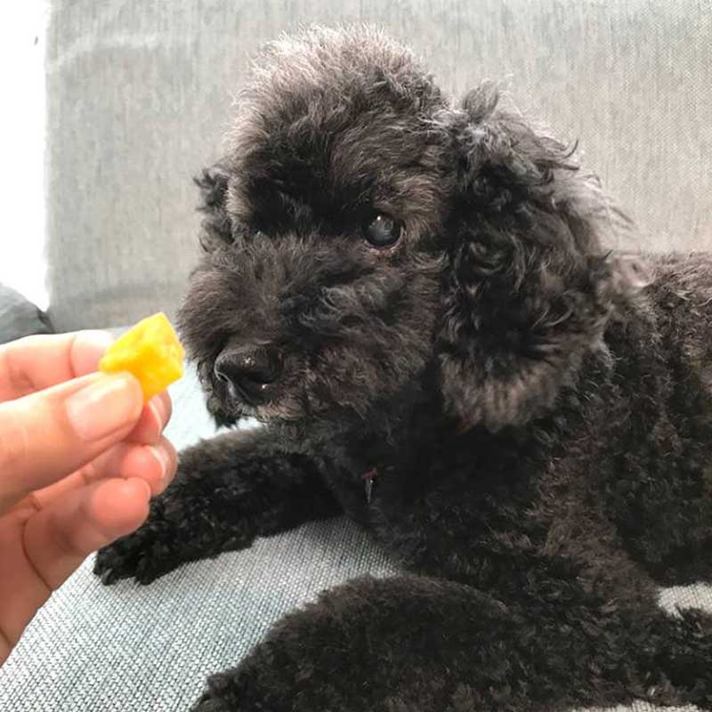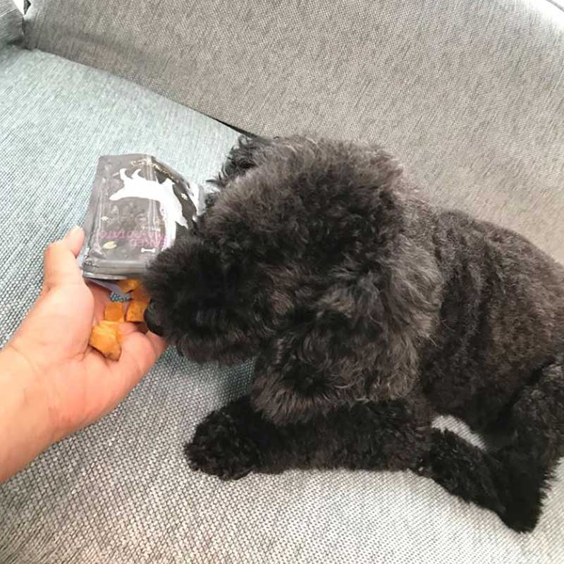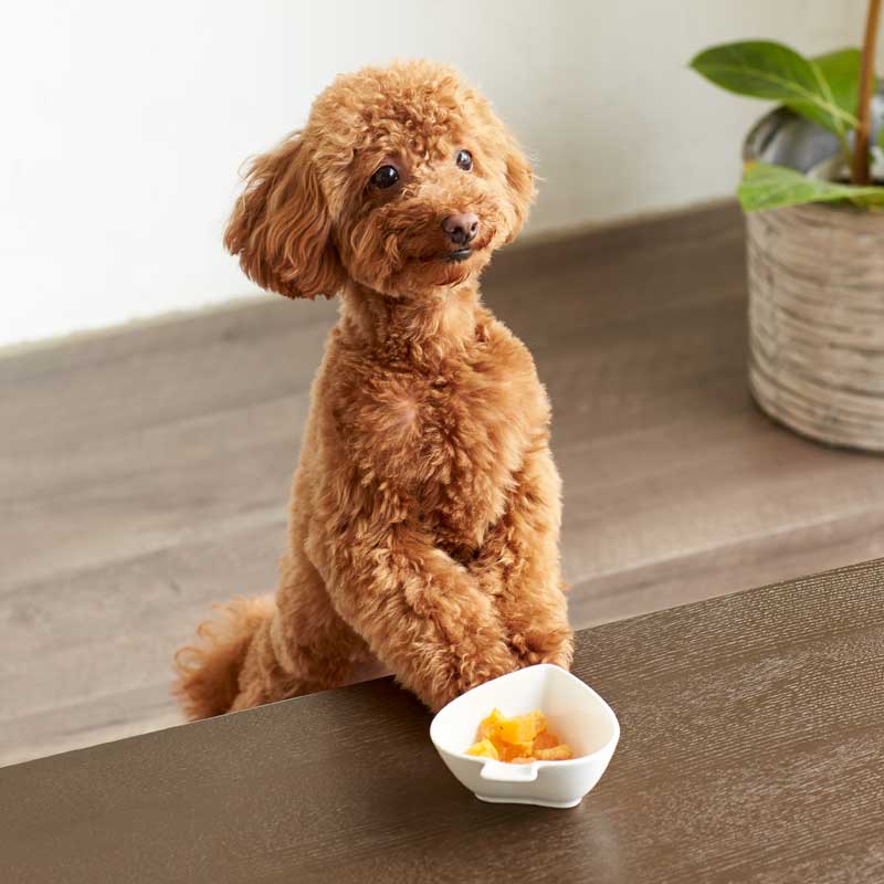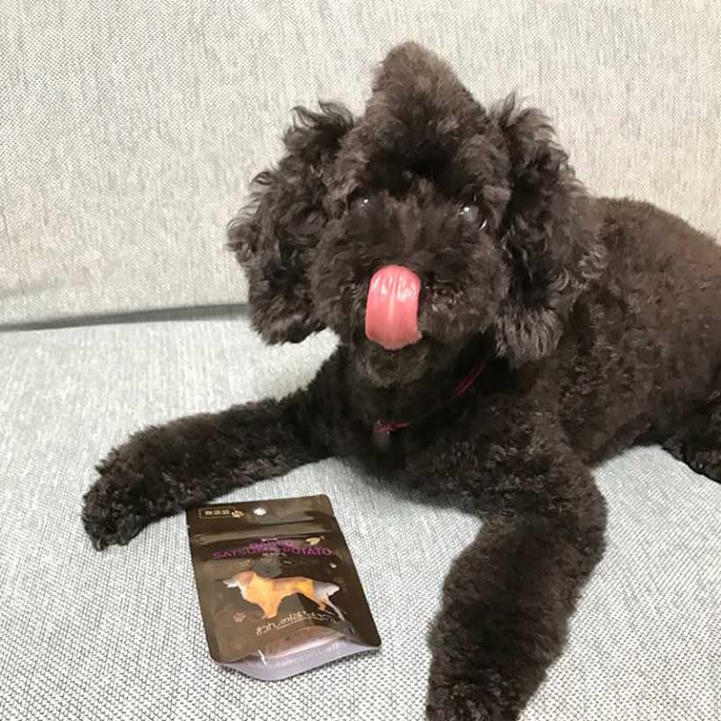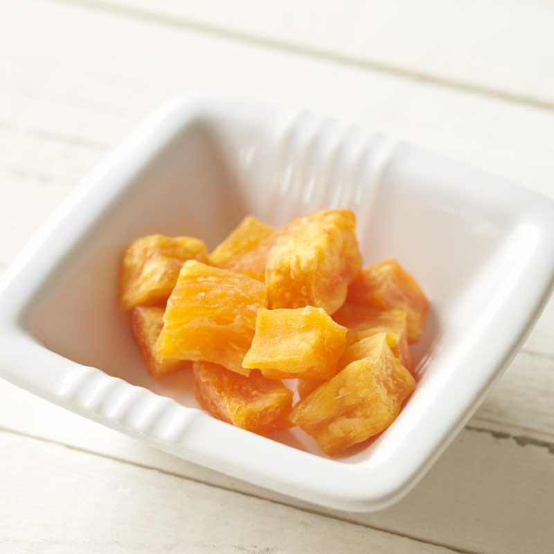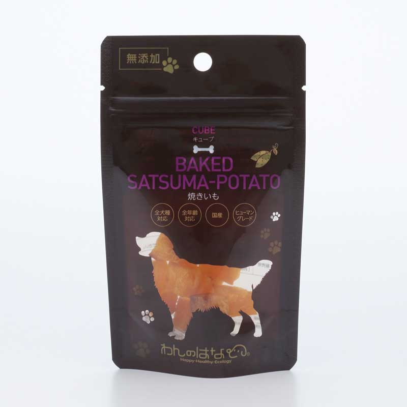 甘みたっぷりの食物繊維が豊富な干し芋を、こんがり焼き上げたキューブ状のわんちゃんが喜ぶおやつです。