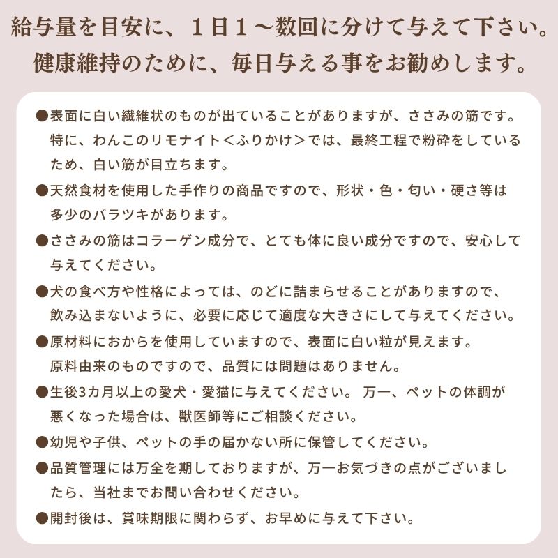 ・表面に白い繊維状のものが出ていることがありますが、ささみの筋です。特に、わんこのリモナイト<ふりかけ>では、最終工程で粉砕をしているため、白い筋が目立ちます。