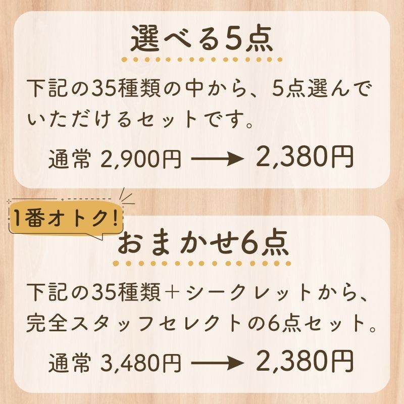 お好きなおやつを下記の種類の中から自由に選んでいただける5点セットと、下記の種類から完全スタッフセレクト5点+シークレット1点の計6点セットのどちらか選んでいただけます。
