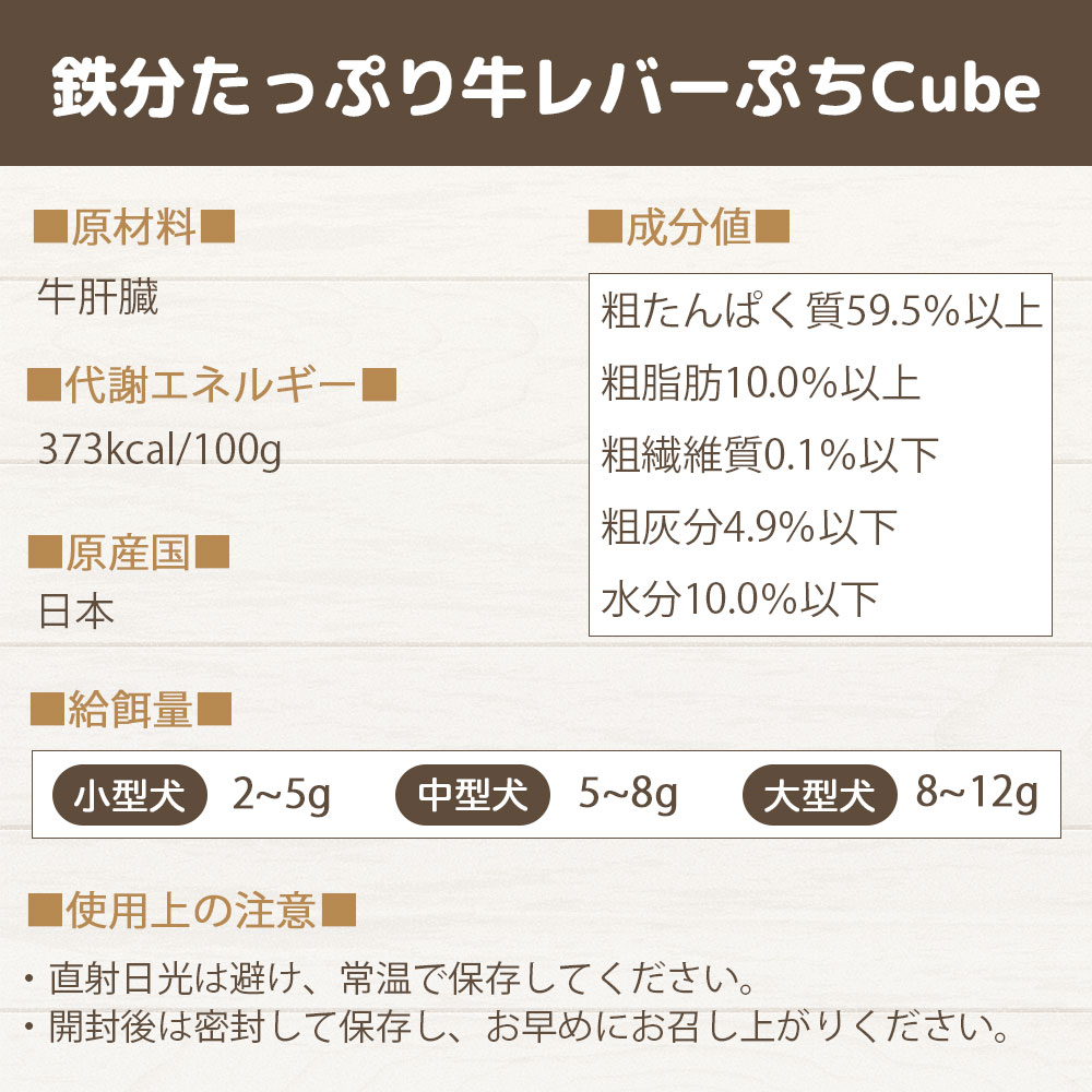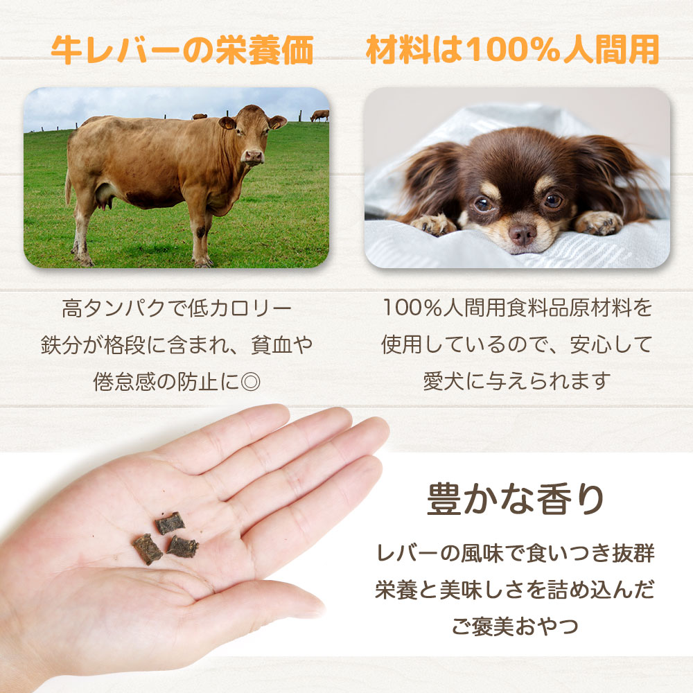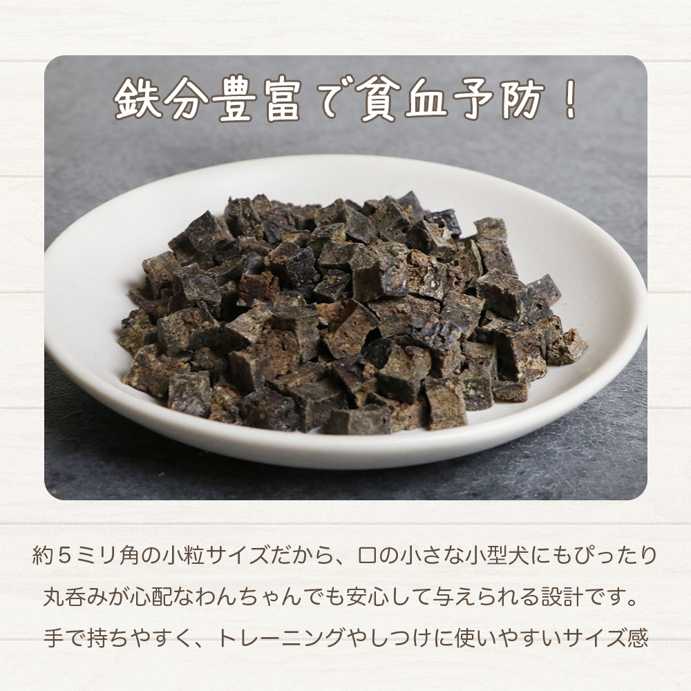 高タンパクで低カロリーの牛レバーを食べやすい小さいキューブ状にしました。 牛レバーには、鉄分が格段に豊富に含まれており、ワンちゃんの貧血防止や倦怠感の防止が期待できます。