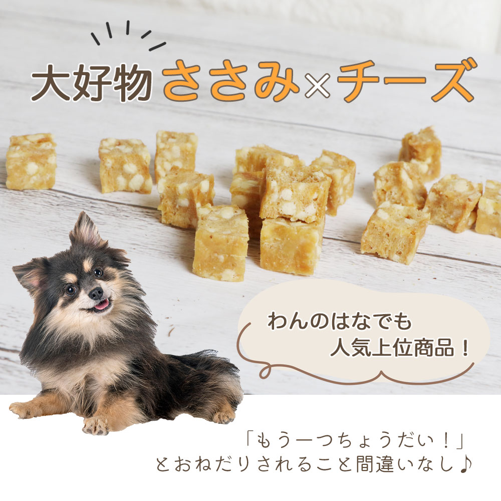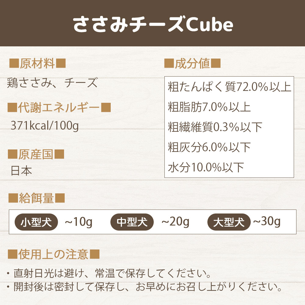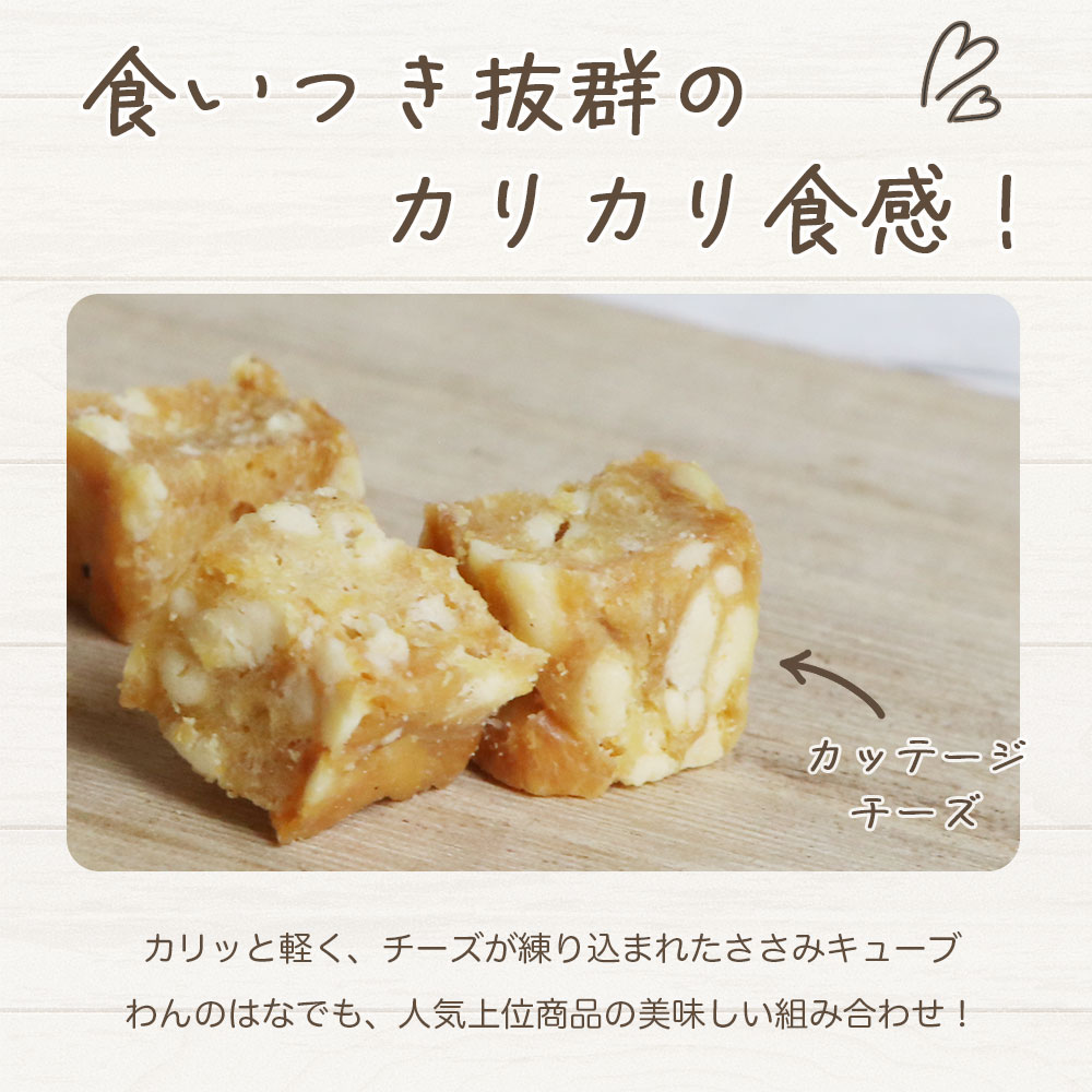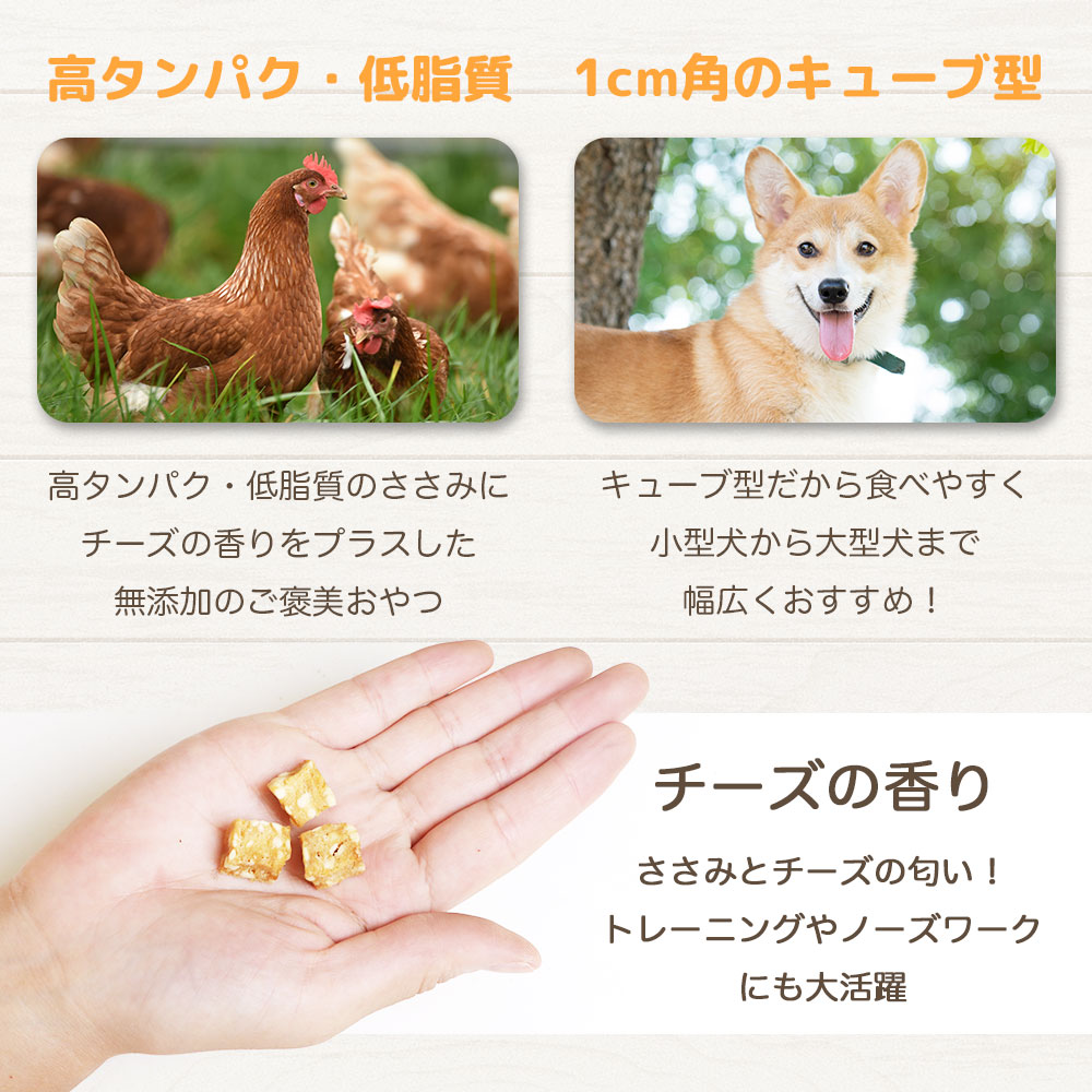 国産無添加のヘルシーな鶏のささ身に、カッテージチーズをミックスし、cube状に成型し乾燥させた、風味と食感、嗜好性抜群なおやつです。