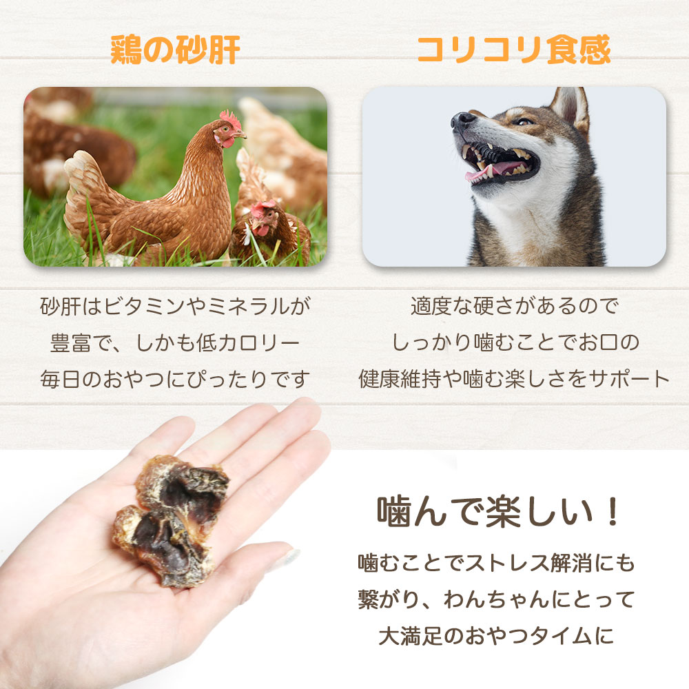 ビタミン、ミネラルが豊富な国産の鶏の砂肝を素材そのままに、じっくり乾燥し適度な硬さに仕上げたハードタイプのおやつです。