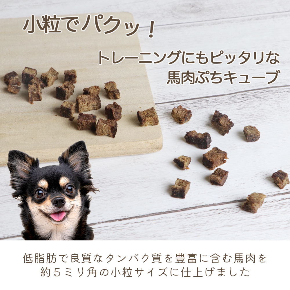 たくさんの栄養素が含まれる馬肉を小型犬でも食べやすい小さいキューブ状にしました。