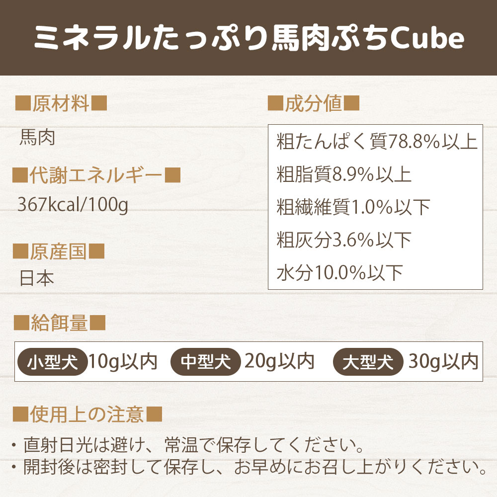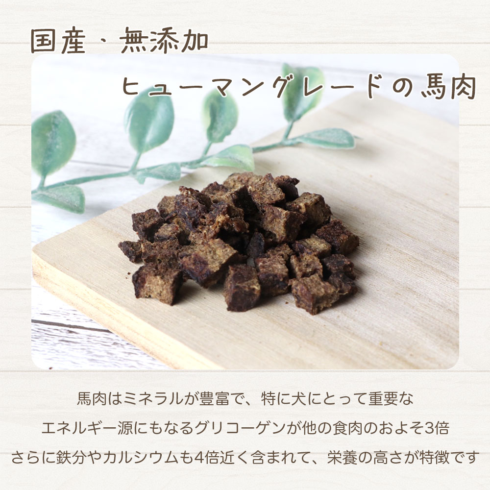 たくさんの栄養素が含まれる馬肉を小型犬でも食べやすい小さいキューブ状にしました。 ミネラルが豊富で、エネルギー源として大切な役割を持つグリコーゲンなども含まれています。 グリコーゲンは他の食肉と比べ3倍。鉄分は3~4倍・カルシウムも3~4倍多く含まれております。 タンパク質も多く他のお肉と比べてとても低カロリーのため食事量が減った老犬やダイエットしたい犬にとって、とても良い食べ物だといわれています。