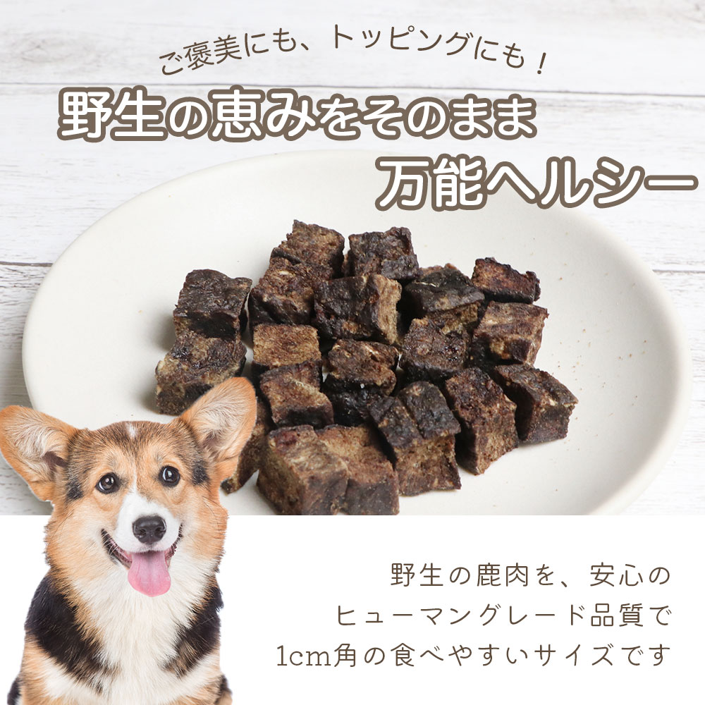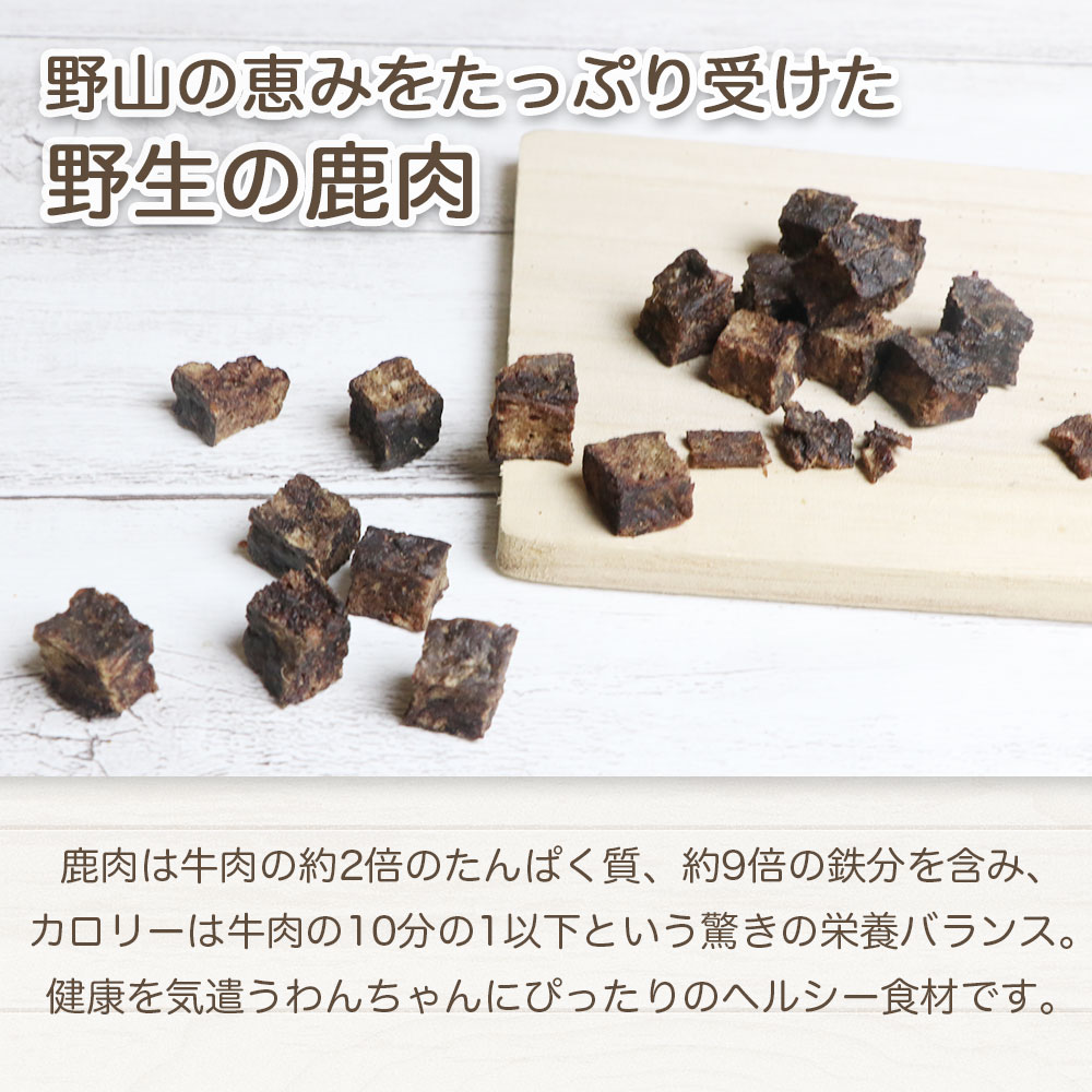 人間食用の熟成部位のみを使用した、高たんぱく、低脂肪の鹿肉をキューブ状にしたおやつです。