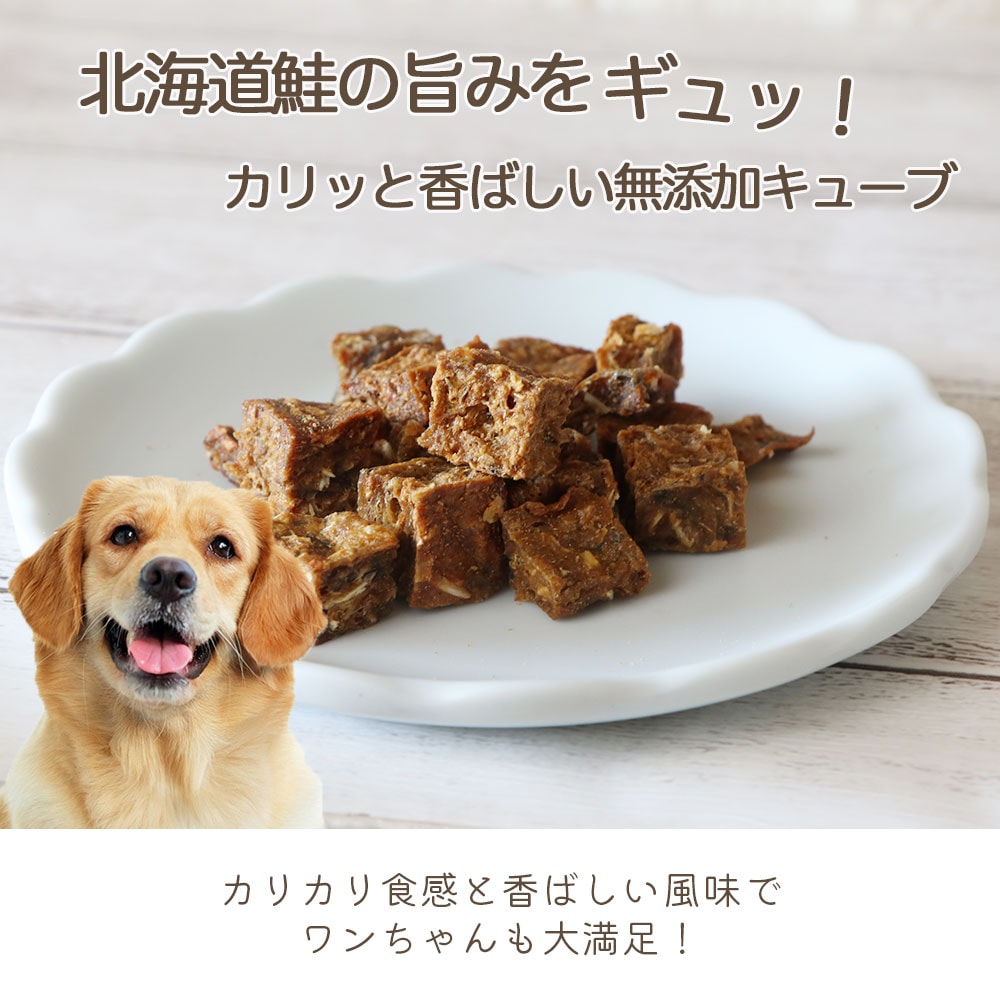国産無添加の新鮮な秋鮭の頭・腹・背骨を取り除いて、ミンチにしcube状に成型し乾燥させた、風味と食感、嗜好性抜群なおやつです。