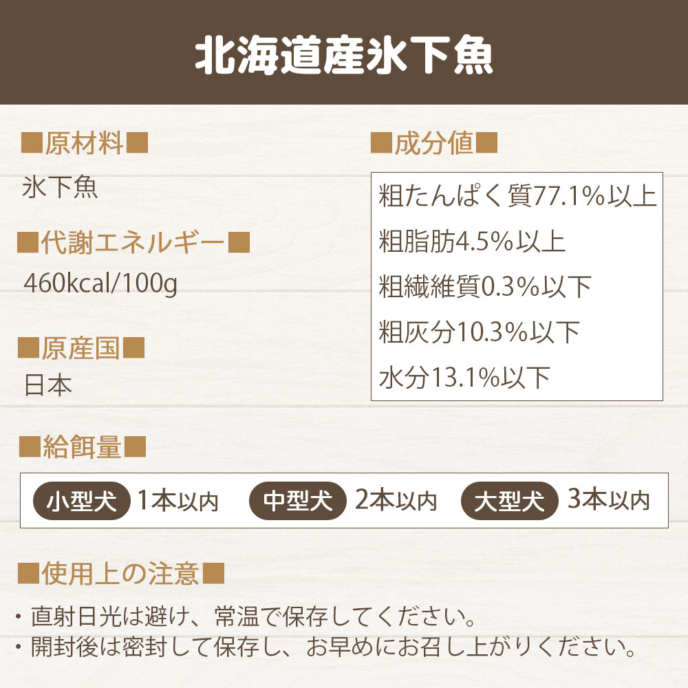 北海道産の天然氷下魚を使用したスティック状の犬用おやつです。