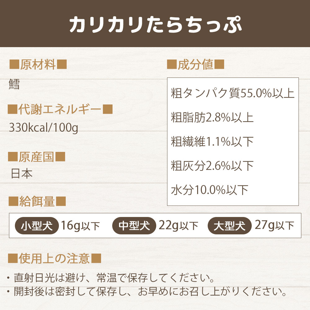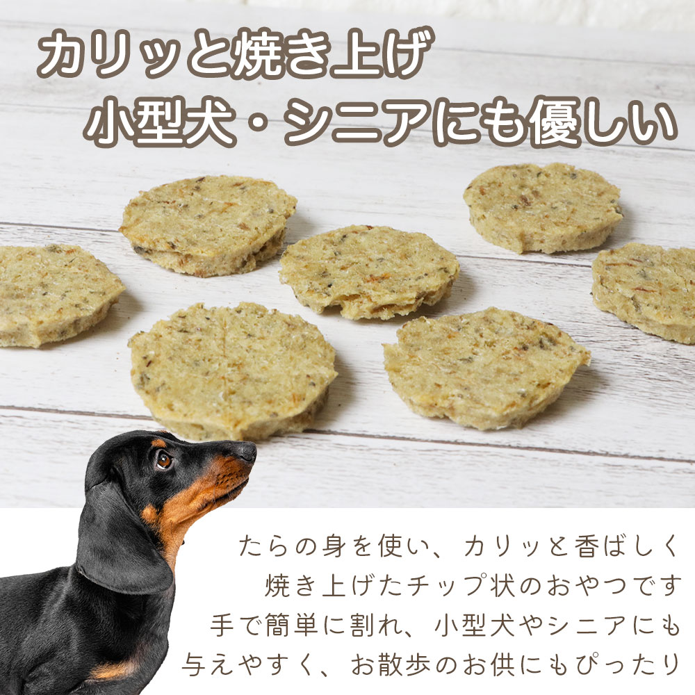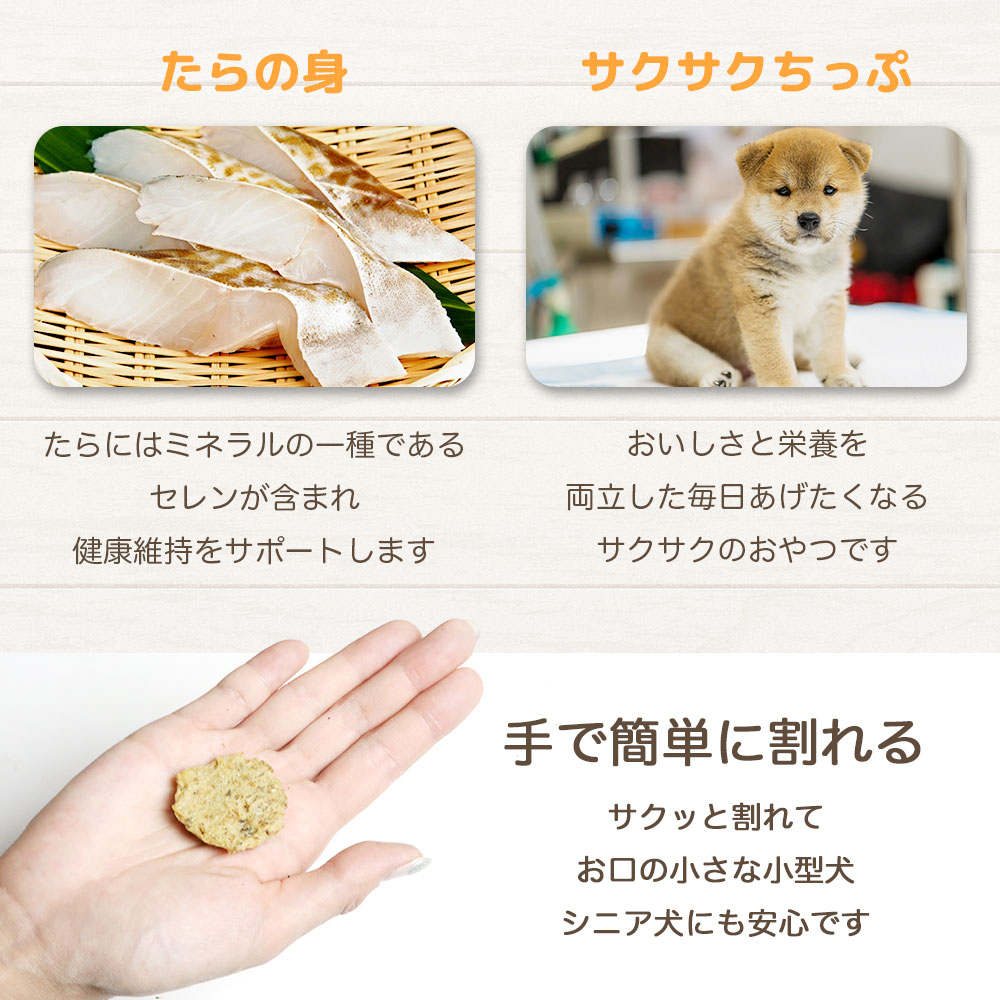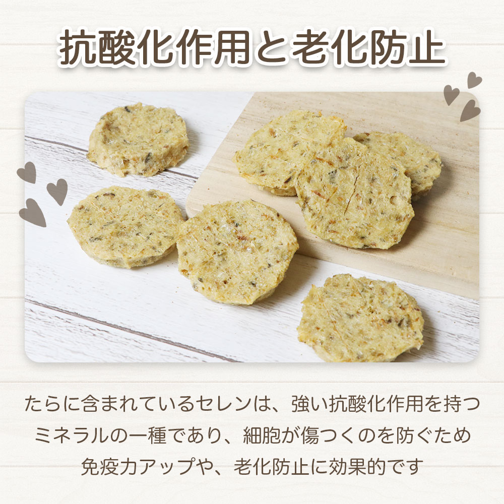 それぞれのわんちゃんに合わせて、手で簡単にパキパキ割って大きさを調節出来るため、しつけやトレーニングのご褒美として、お散歩のおともにもおすすめです。 たらに含まれているセレンは、強い抗酸化作用を持つミネラルの一種であり、細胞が傷付くのを防ぐため、免疫力アップや、老化防止に効果的です。