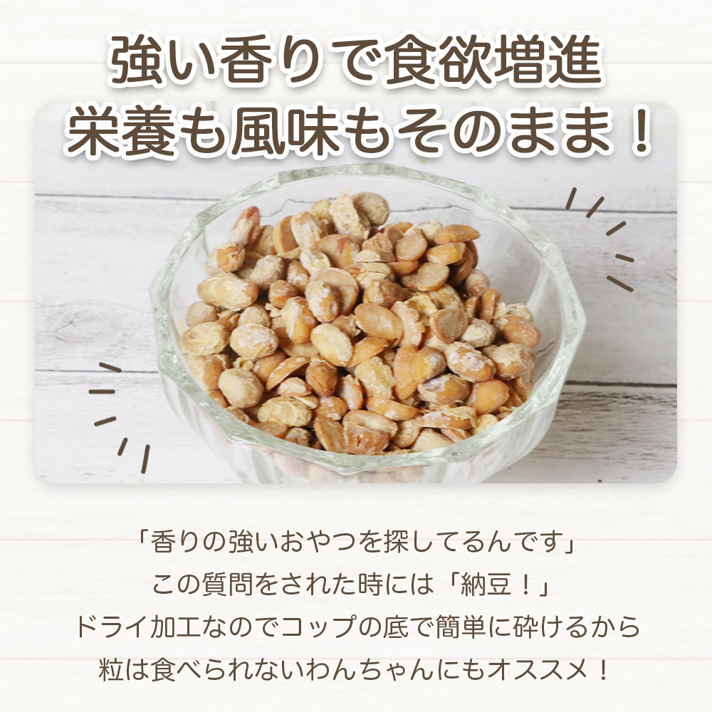 わんちゃんにも納豆を! 納豆にはたんぱく質を分解するナットウキナーゼという酵素が含まれています。血液をサラサラに保ち、脳血栓や脳梗塞の予防に役立ちます。 また、水溶性食物繊維と不溶性食物繊維のどちらも含まれています。納豆菌が腸内の善玉菌(乳酸菌やビフィズス菌)のエサになることで、腸内環境を良くしてくれる働きがあります。