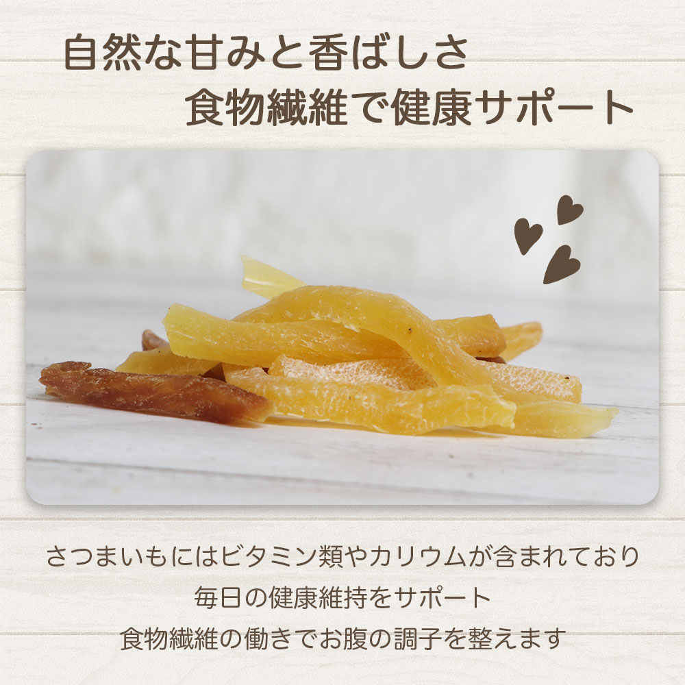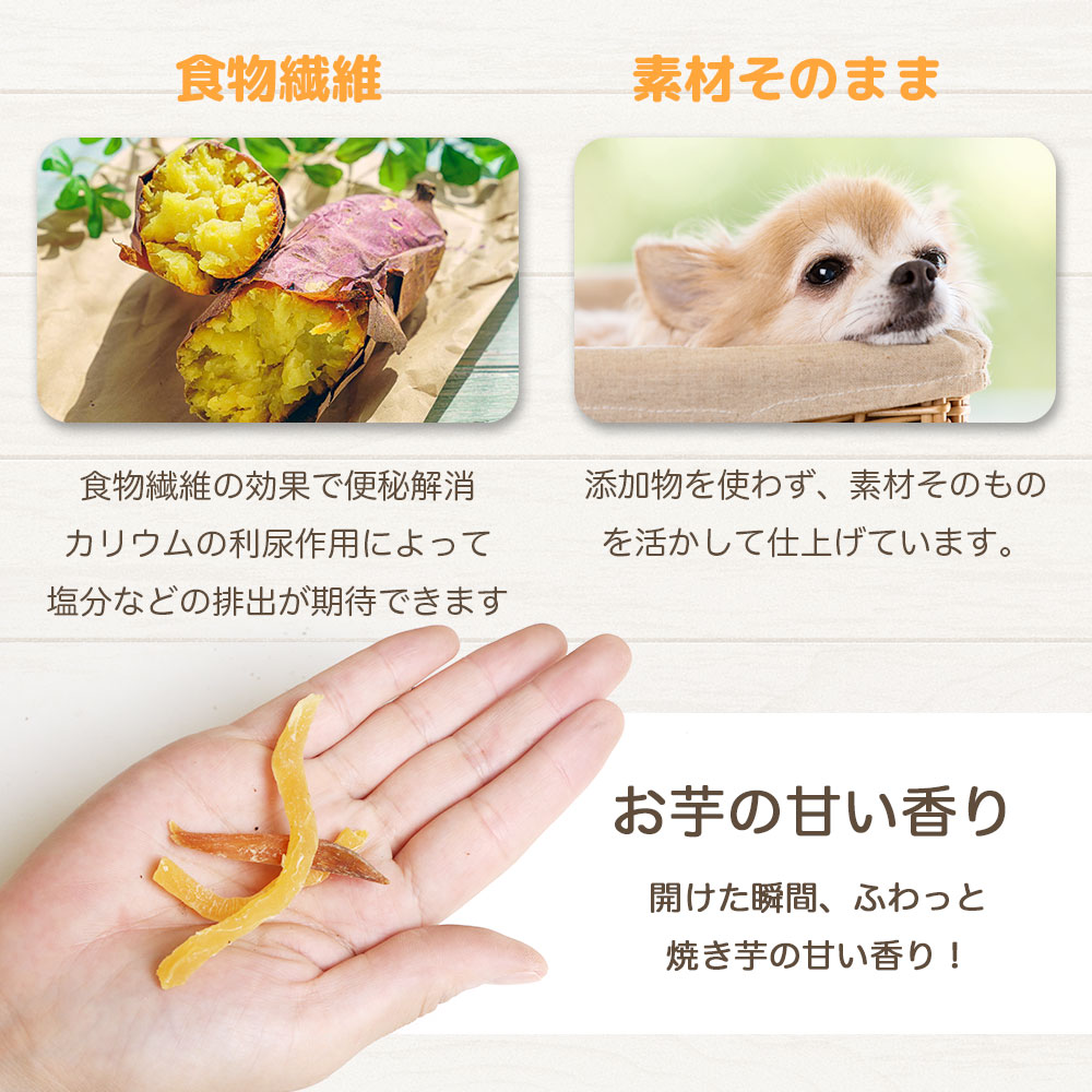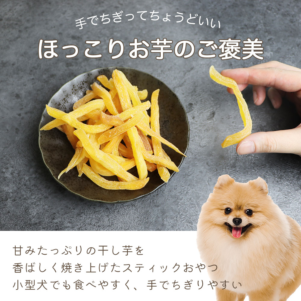 甘みたっぷりの食物繊維が豊富な干し芋を、こんがり焼き上げたスティック状のわんちゃんが喜ぶおやつです。