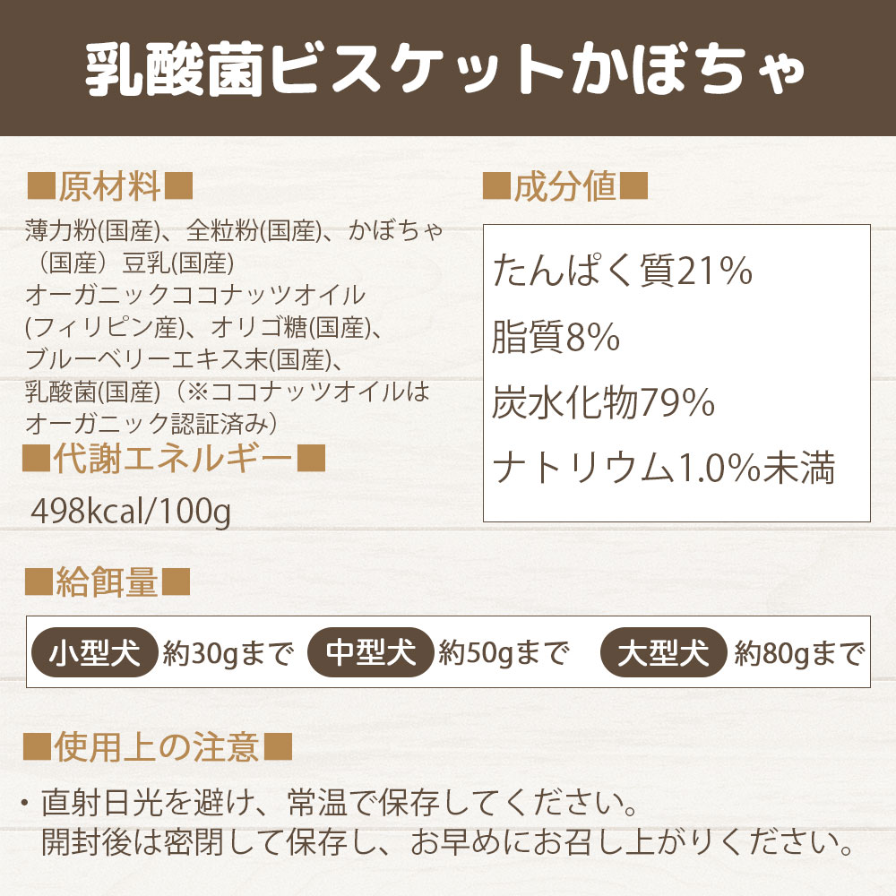 500億個の乳酸菌EC-12とオリゴ糖にかぼちゃを配合、100%人間用食品原料を使用した完全無添加の手作りおやつです。