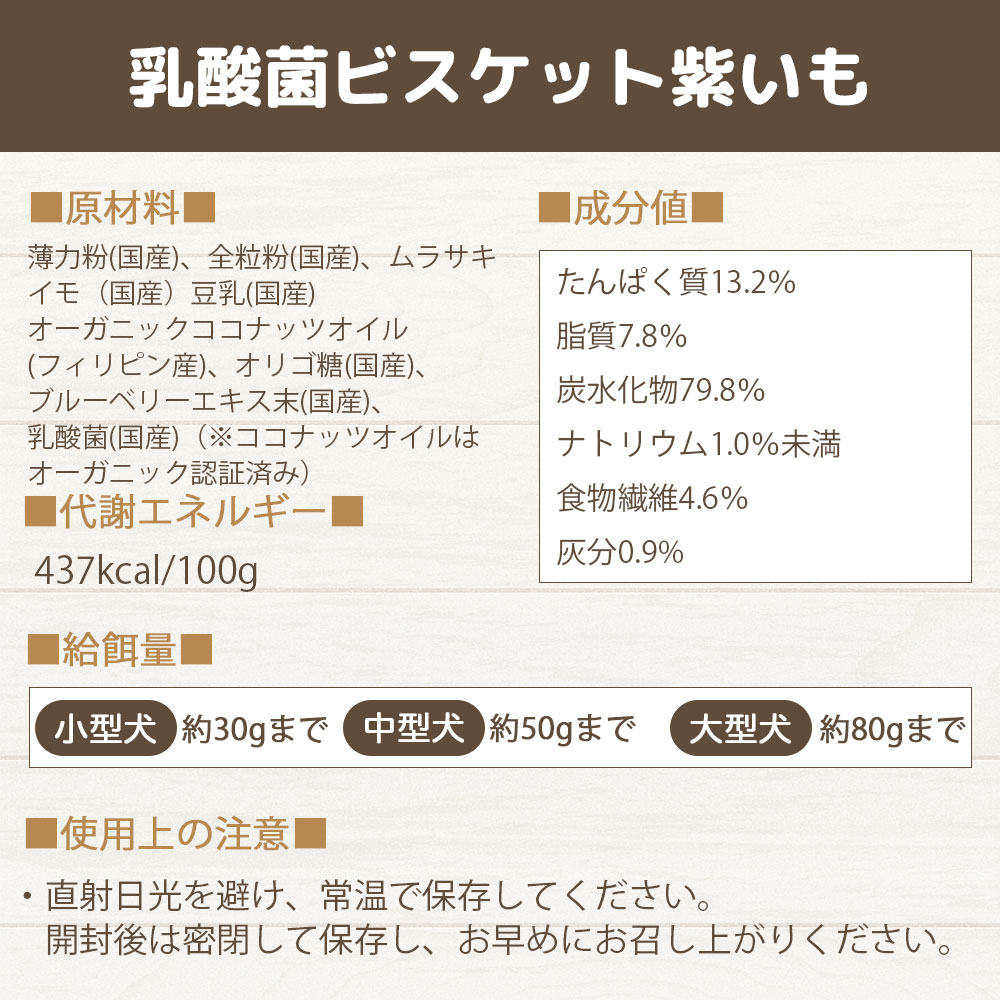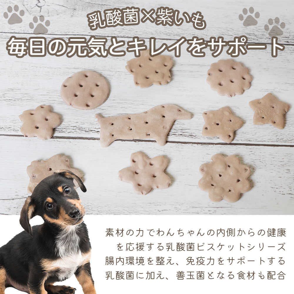 500億個の乳酸菌EC-12とオリゴ糖にムラサキイモを配合、100%人間用食品原料を使用した完全無添加の手作りおやつです。