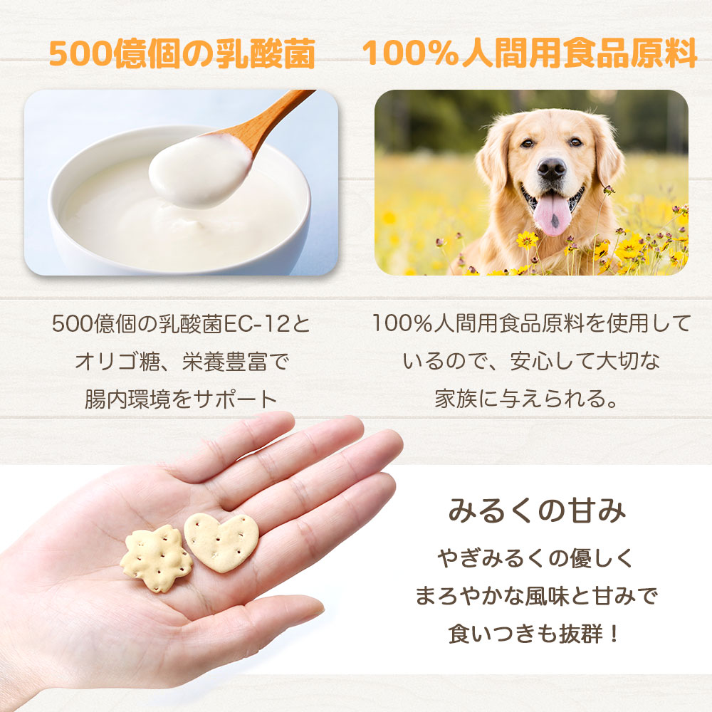 500億個の乳酸菌EC-12とオリゴ糖にヤギミルクを配合、100%人間用食品原料を使用した完全無添加の手作りおやつです。