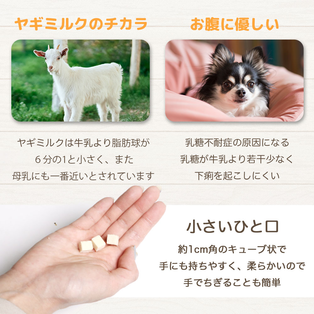小型犬でも食べやすいソフトタイプのキューブです。 国産の美味しい嬉しいヤギミルクです。