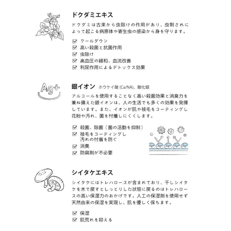 ドクダミエキスにはドクダミを嫌う虫を寄せ付けません。また、シイタケエキスに入っているトレハロースの保湿効果により、肌や被毛の潤いを保ちます。